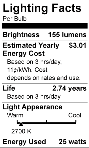 Duro-Lite incandescent light bulbs last much longer than standard incandescent light bulbs with an average rated life of up to 6,000 hours. Designed for decorative applications, Duro-Lite light bulbs have a 2-year residential warranty.This 25-watt C15 Duro-Lite Flamescent incandescent light bulb has an amber finish and a fiberglass winding that simulates the look of a real flame. It is perfect for chandeliers and decorative fixtures.