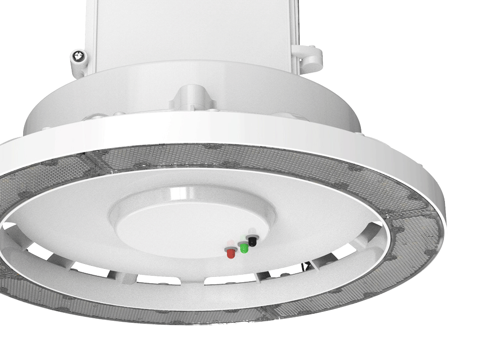 This high bay emergency light fixture includes a monthly self-testing function which operates at 30-day intervals for 5 minutes and 360-day intervals for 90 minutes. Functionality can also be tested on demand via remote control.