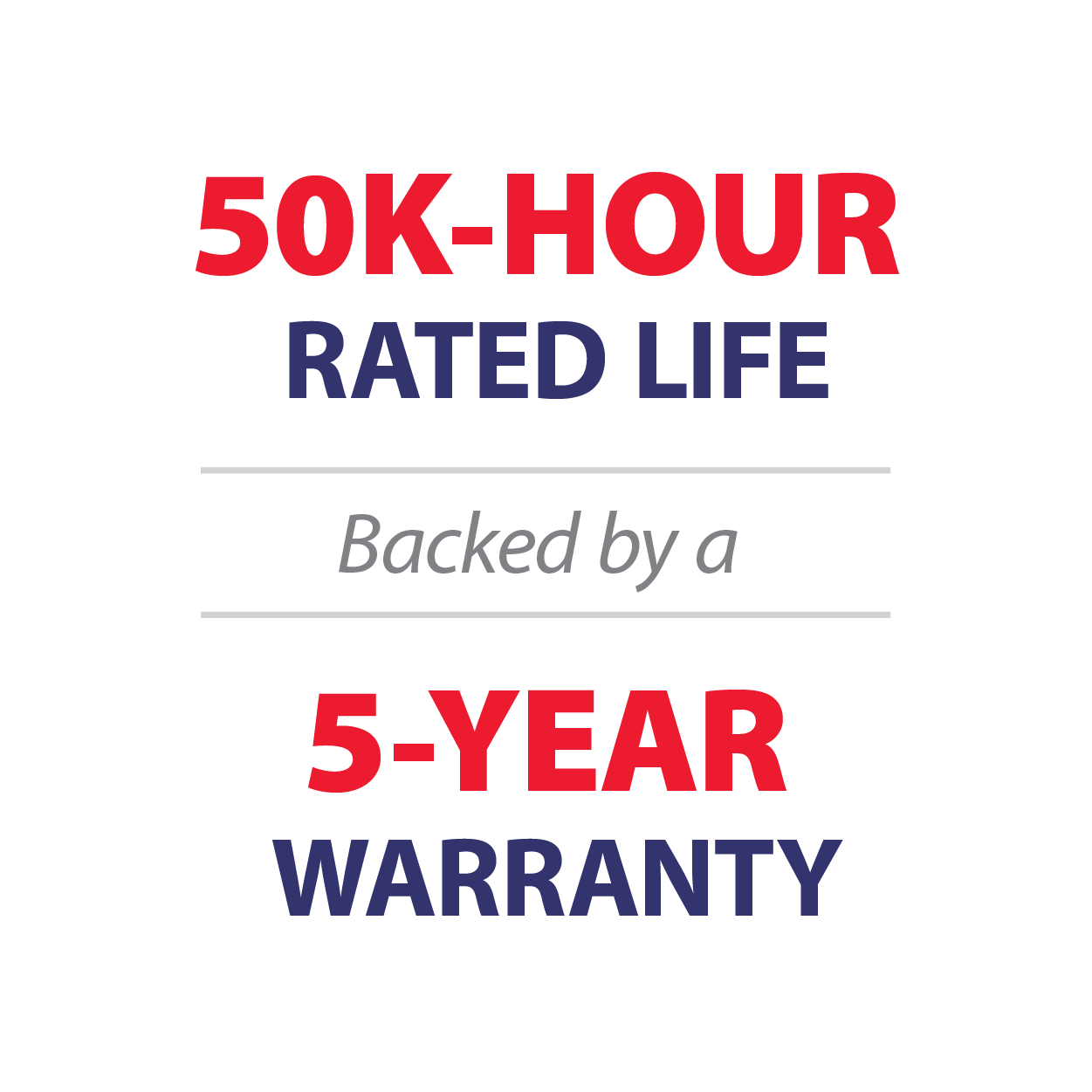 - Rated for up to 50,000 hours and backed by a 5-year warranty of uninterrupted, highly efficient light.