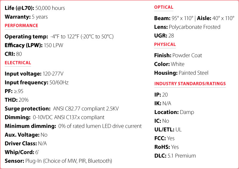 Each Linear High Bay can be individually fine-tuned to deliver the necessary light and functionality for your space. While highly efficient on its own, this fixture can accommodate a pluggable sensor, which can be added on to enable occupancy sensing and daylight harvesting.