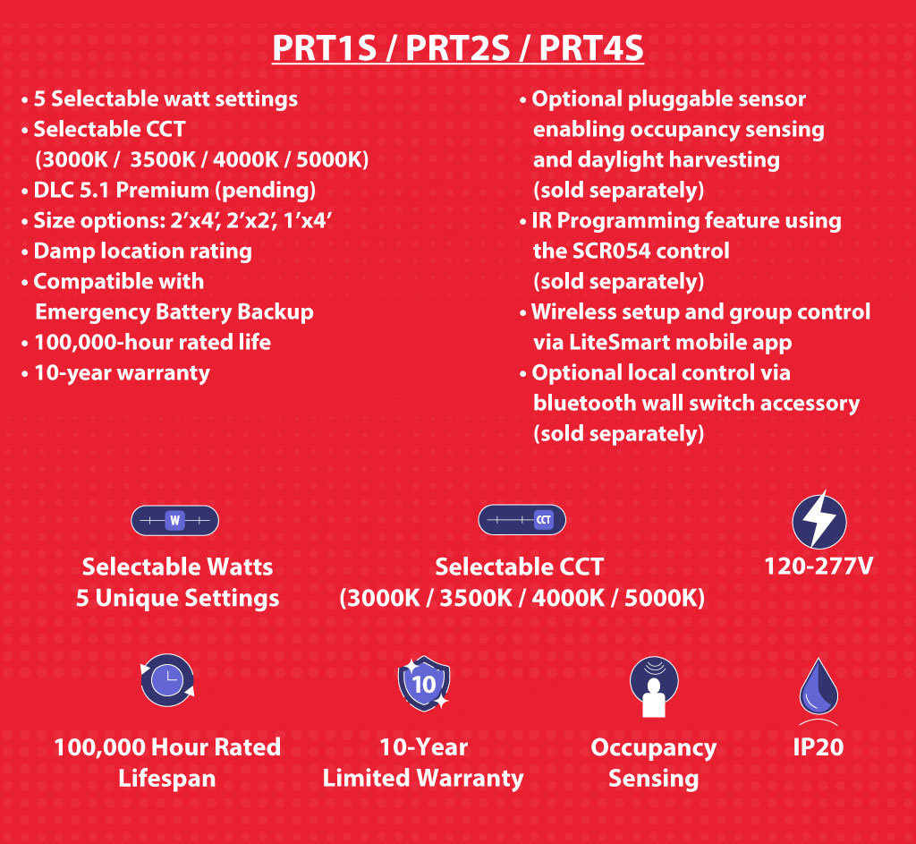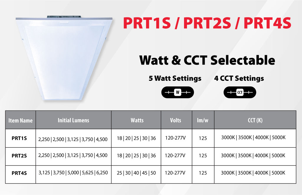 Each fixture includes up to 5 selectable watt settings and 4 options for color temperature (3000K/3500K/4000K/5000K).