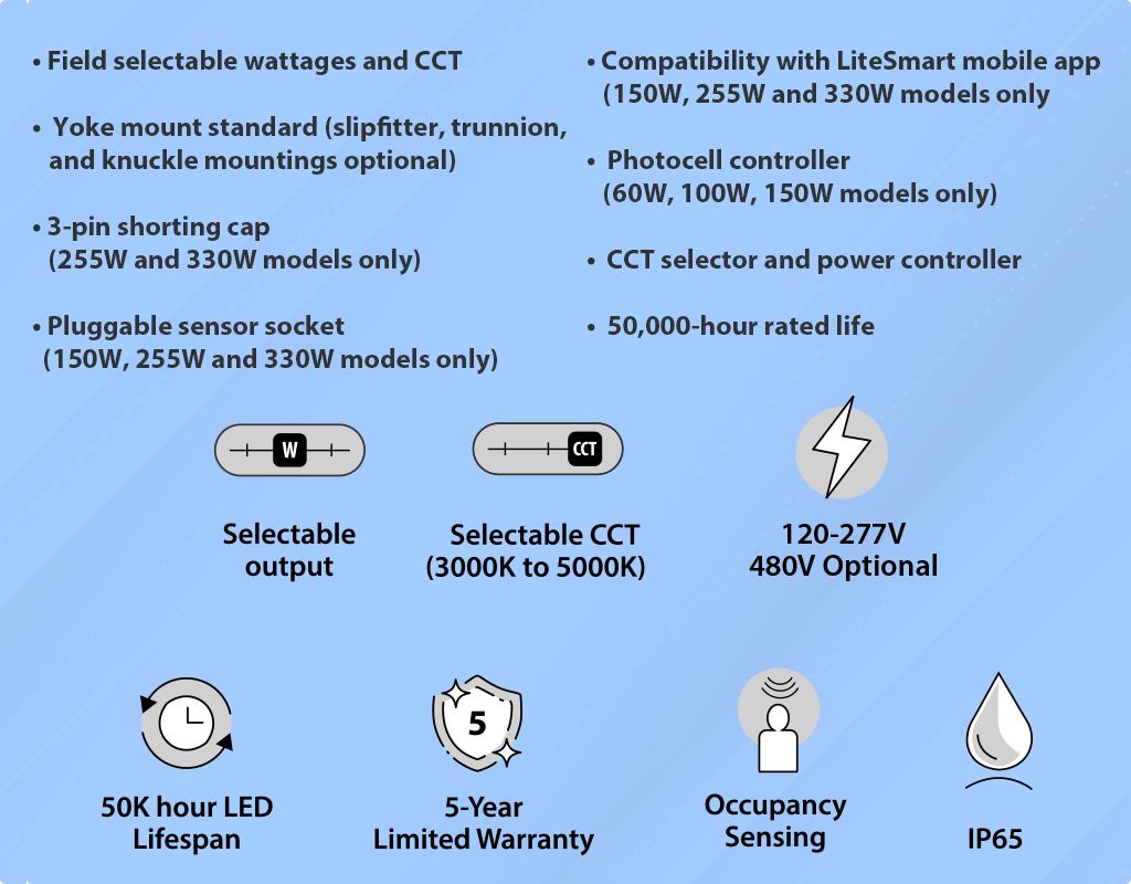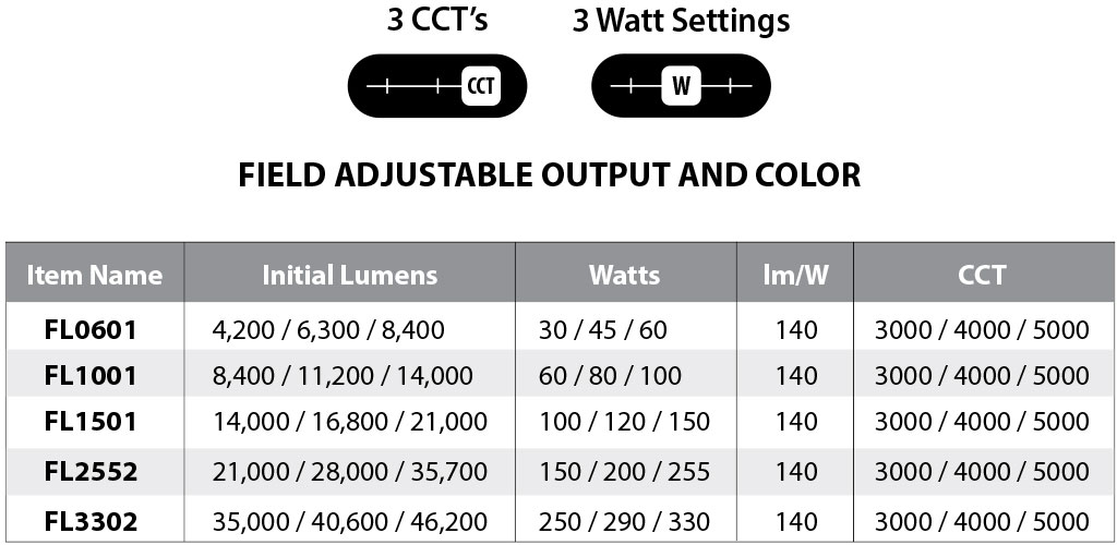 Field adjustable features for output and CCT allows for the flexibility of controlling the flood light fixture to your exact needs.