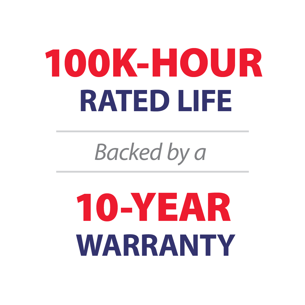 • Rated for up to 100,000 hours and backed by a 10-year warranty, you’re looking at well over a decade of uninterrupted, highly efficient light.