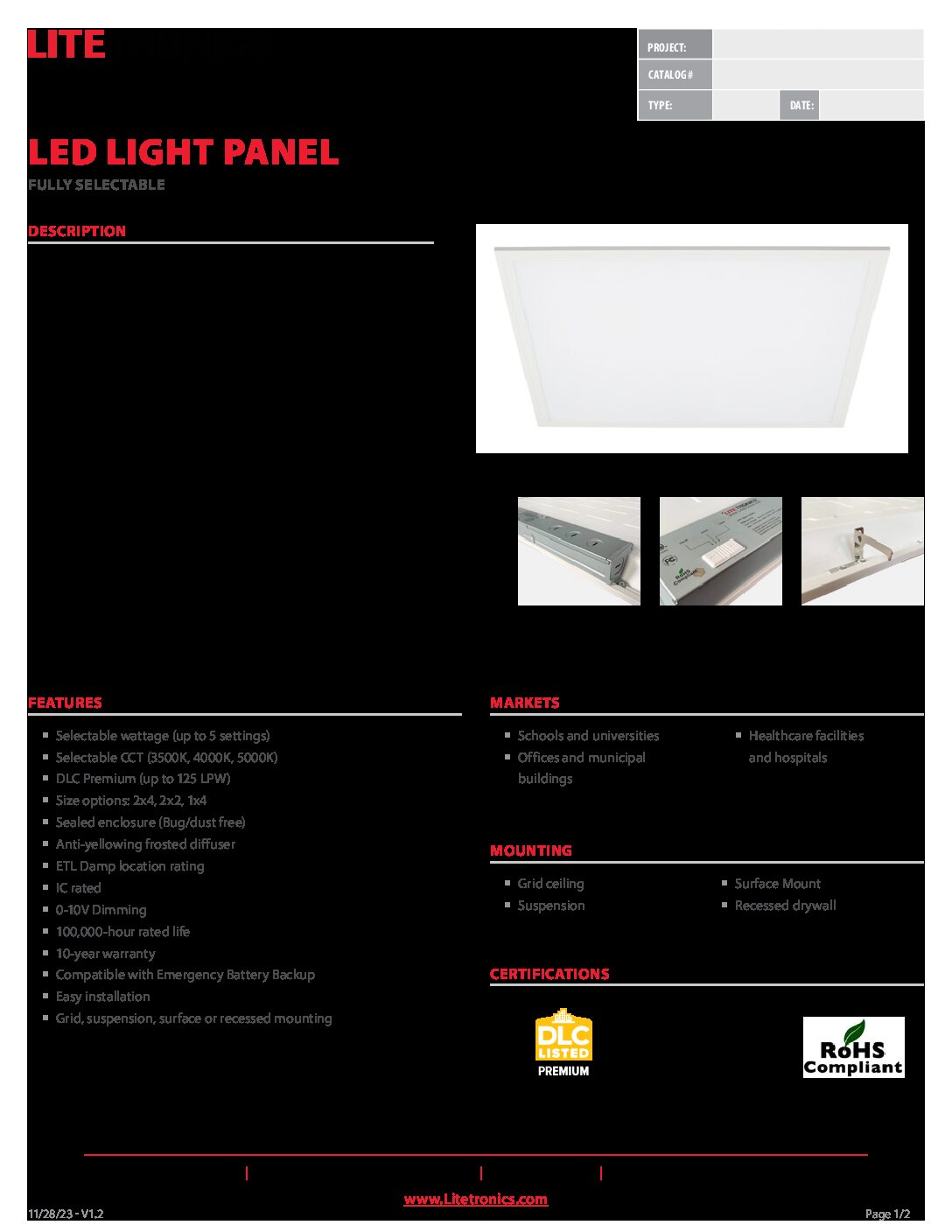 Light Panel – Adjustable Wattage- Spec Sheet